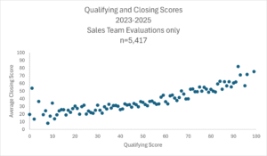 - Objective Management Group. Analysis of Sales Evaluations conducted January 1, 2023 through December 31, 2025. Internal dataset. Qualifying and Average Closing Scores of Salespeople.